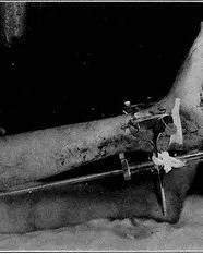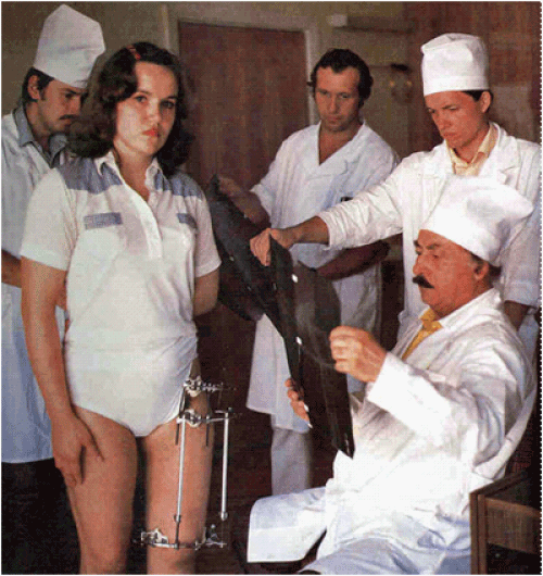 博洛尼亚的 Alessandro Codivilla 是第一个应用骨骼牵引来延长骨骼的人。他在麻醉剂下使用了短距离的急性强制延长。他描述了另一种通过持续伸展来实现更大距离的技术,使用跟骨针牵引和斜截骨术,然后牵引 25-30 公斤。然后可以通过分阶段施加更多的牵引力来实现更多的延长 [1]。 Fassett 使用截骨术、插入骨移植物并用钢板固定来开发一期延长术。然而,这个过程伴随着许多严重的并发症